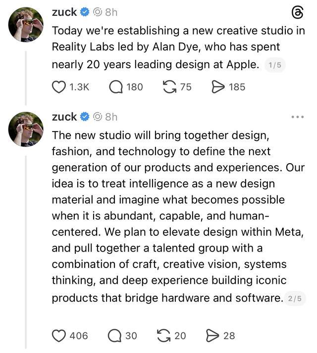 智东西12月4日消息,今天,Meta首席执行官马克·扎克伯格(Mark Zuckerberg)在社交平台Threads上发布帖子官宣,苹果人机交互设计副总裁、用户界面设计负责人艾伦·戴伊(Alan Dye)将加入Meta,并称“正在建立一个由戴伊领导的全新设计工作室,并将智能视为一种新的设计材料”。